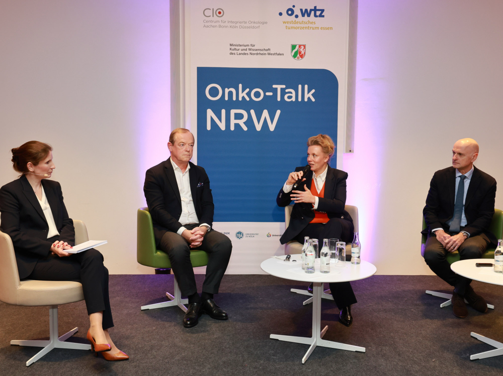 Auf dem Podium diskutierten Univ.-Prof. Dr. Michael Hallek, Direktor der Klinik I für Innere Medizin und des Centrums für Integrierte Onkologie (CIO) an der Uniklinik Köln, Univ.-Prof. Dr. Martin Schuler, Direktor der Inneren Klinik (Tumorforschung) am Westdeutschen Tumorzentrum (WTZ) des Universitätsklinikums Essen, und die nordrhein-westfälische Wissenschaftsministerin Ina Brandes MdL über spektakuläre Forschung „made in NRW“. Ein zentrales Beispiel für diese erfolgreiche Forschung lieferte Prof. Dr. Peter Borchmann, Oberarzt an der Uniklinik Köln und Leiter der Deutschen Hodgkin Studiengruppe (GHSG) – der weltweit größten und bedeutendsten akademische Forschungsgruppe für das Hodgkin Lymphom: Dank klinischer Forschung sank die Sterblichkeit beim Hodgkin-Lymphom von 99 Prozent im Jahr 1970 auf heute rund ein Prozent.